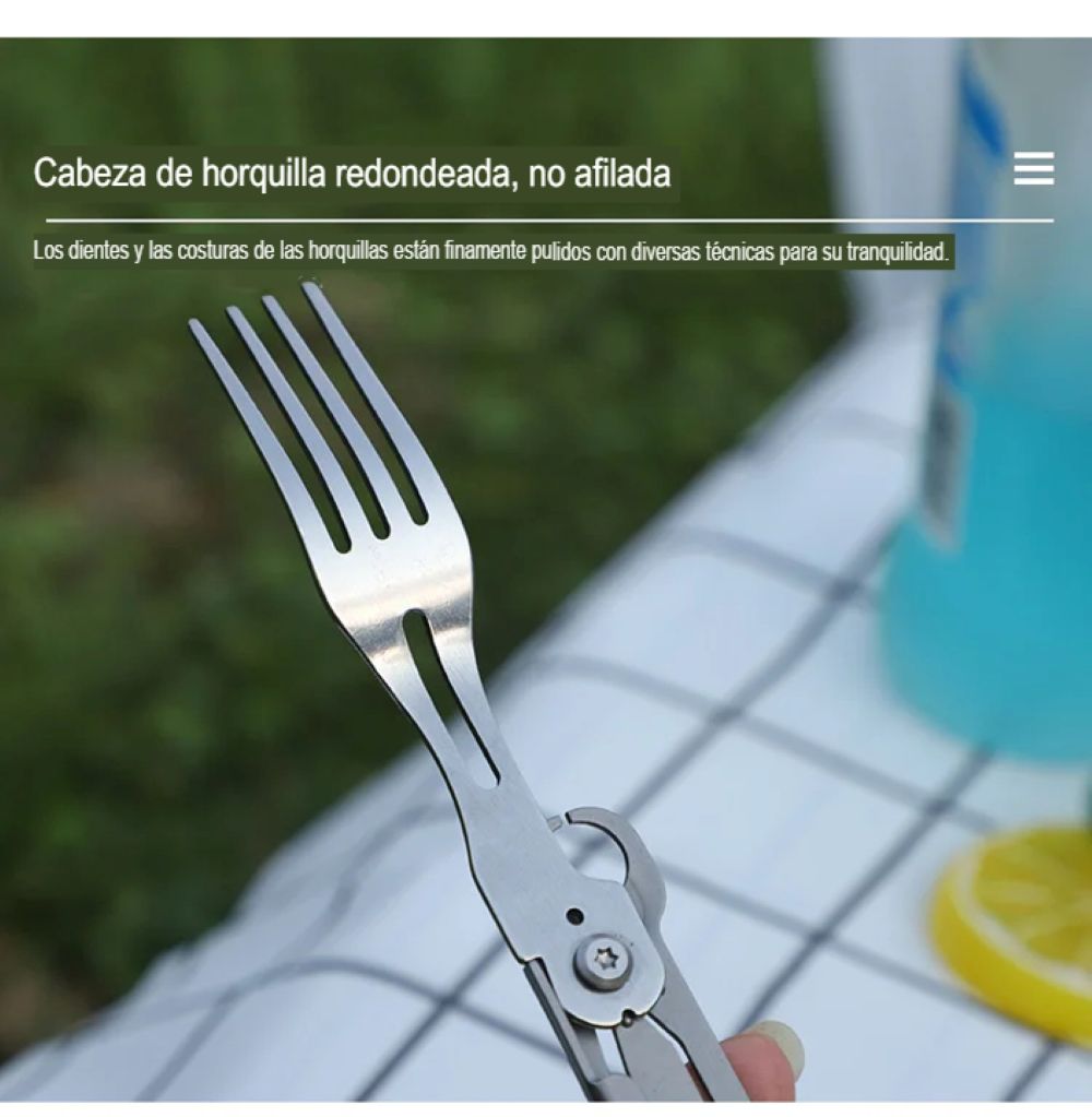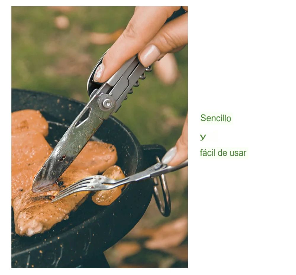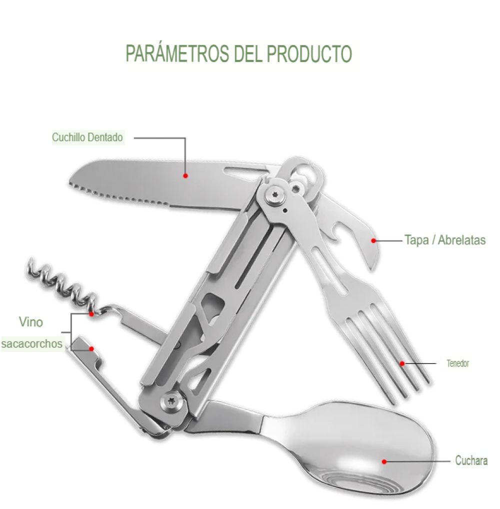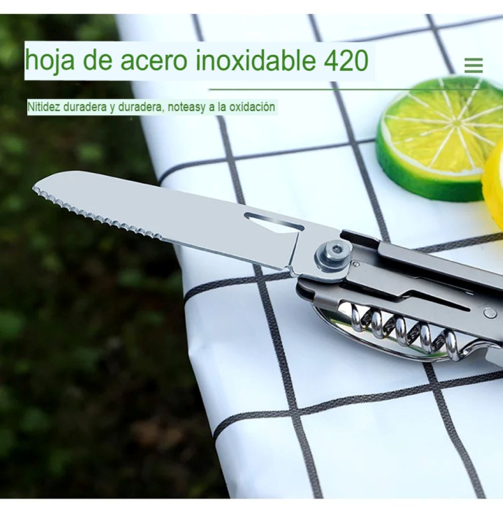 Este juego plegable se caracteriza por un diseño multifuncional, que le permite ser utilizada como tenedor, cortador, cuchara, Abrebotellas y sacacorchos, básicamente para satisfacer sus necesidades de acampada al aire libre.