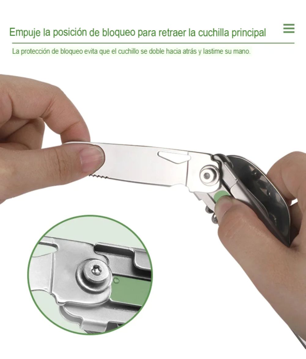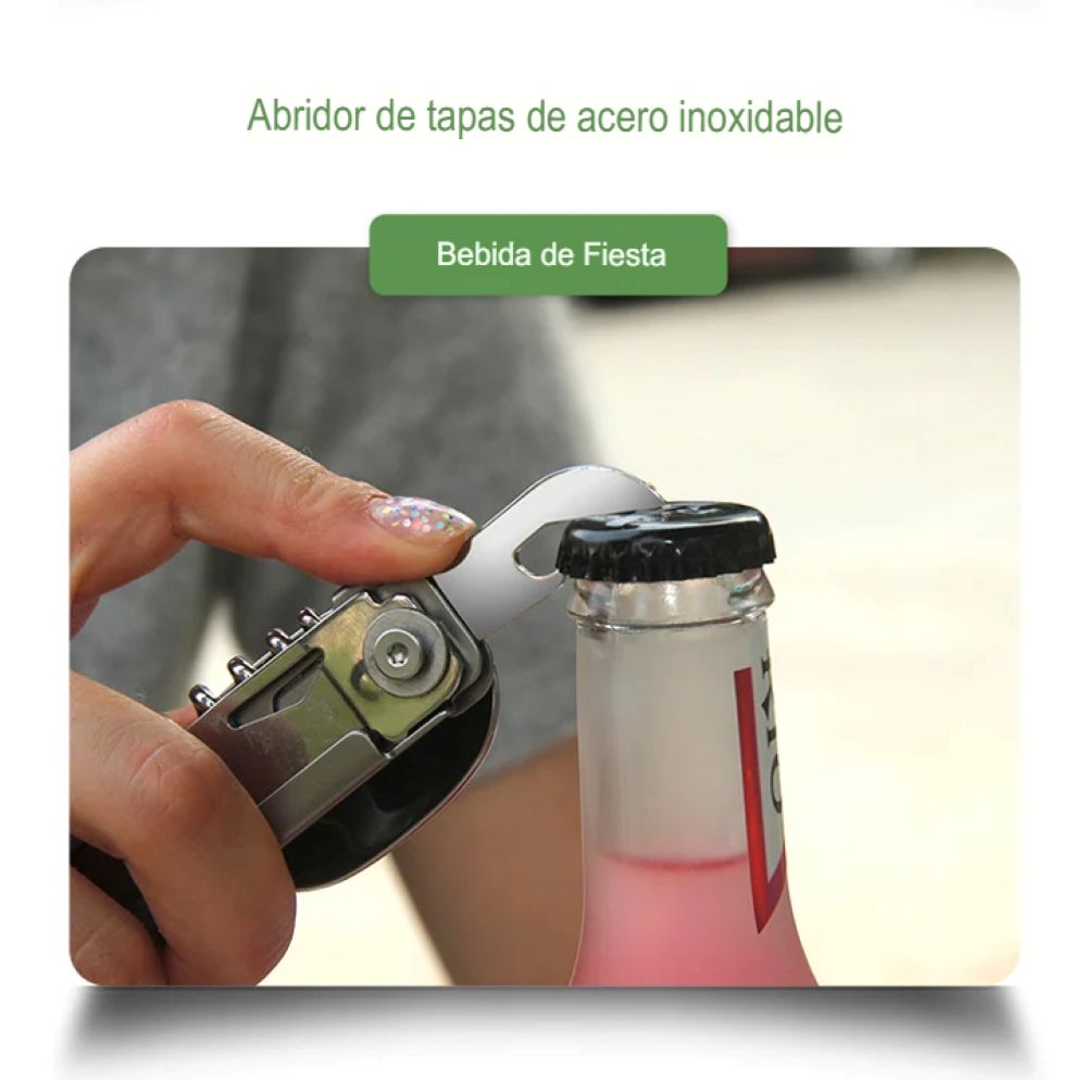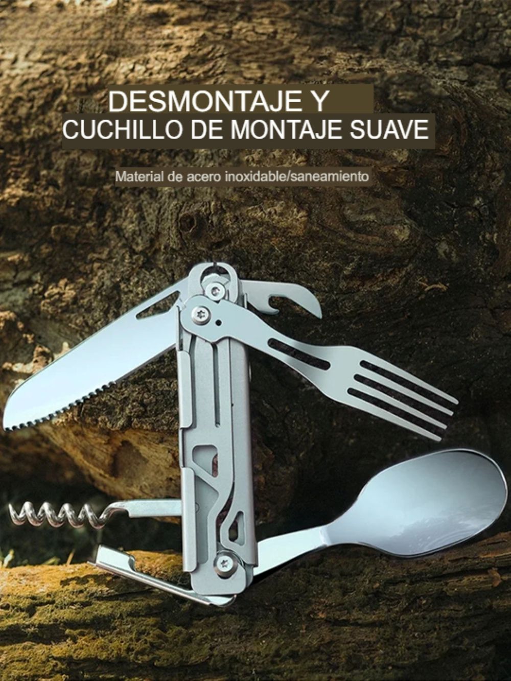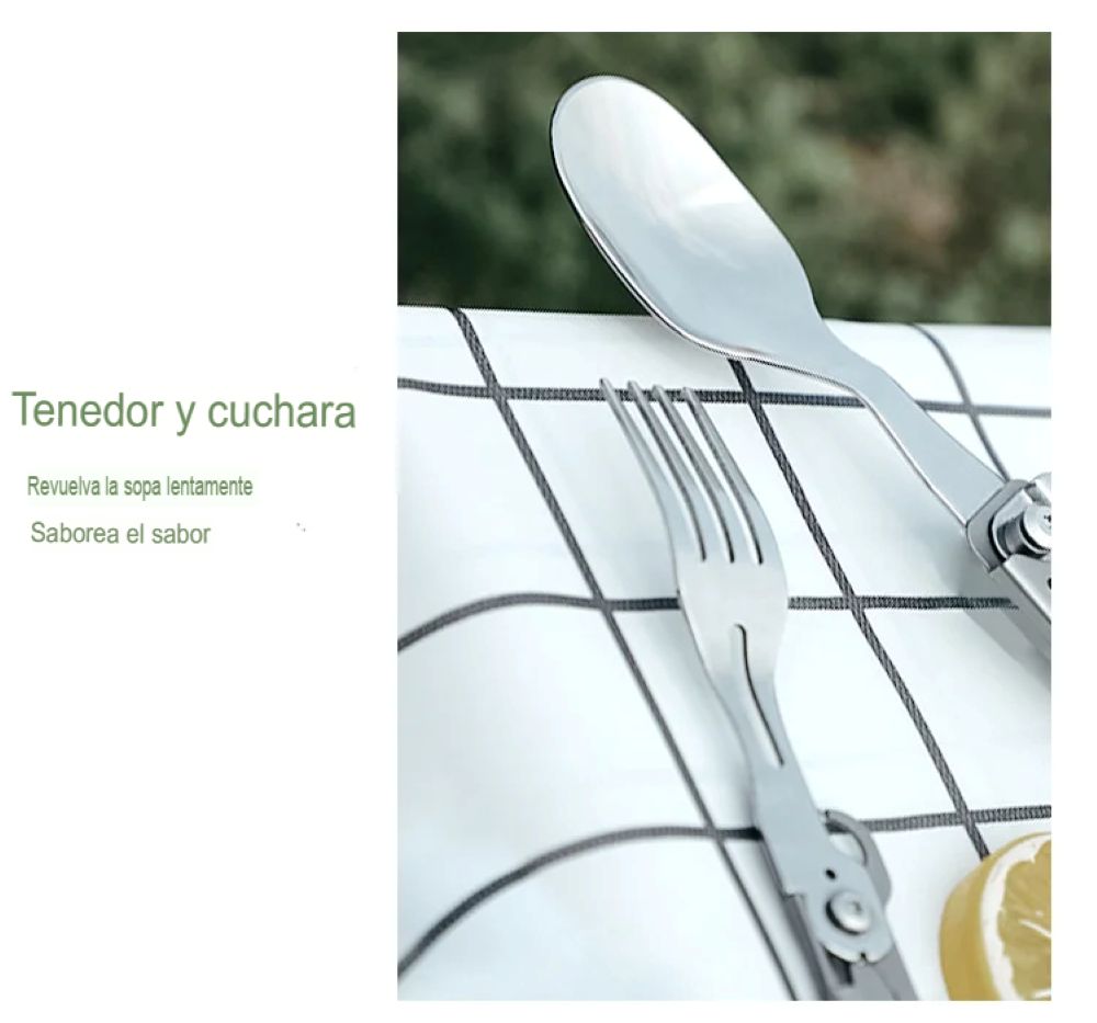 Este juego plegable se caracteriza por un diseño multifuncional, que le permite ser utilizada como tenedor, cortador, cuchara, Abrebotellas y sacacorchos, básicamente para satisfacer sus necesidades de acampada al aire libre.