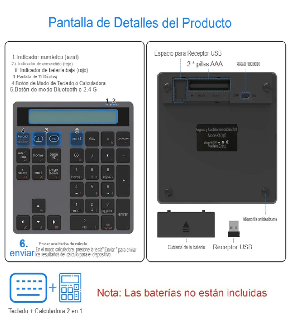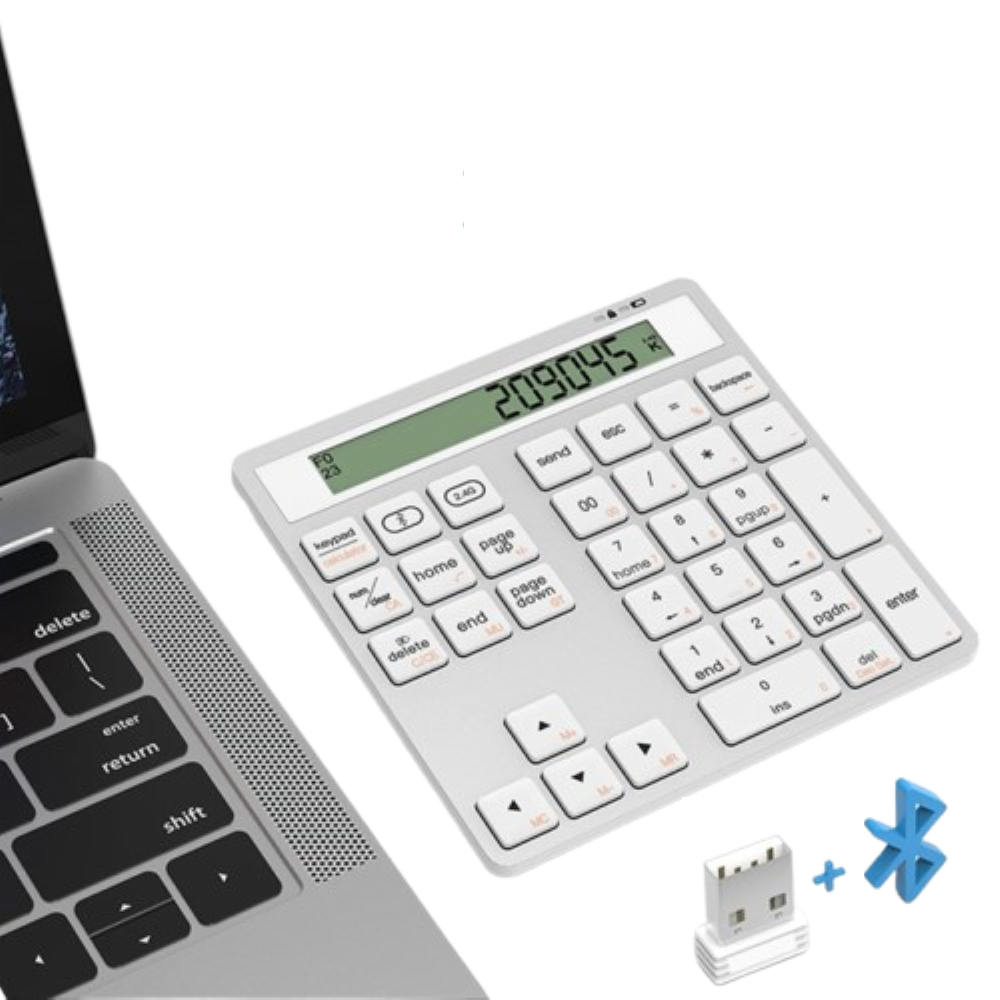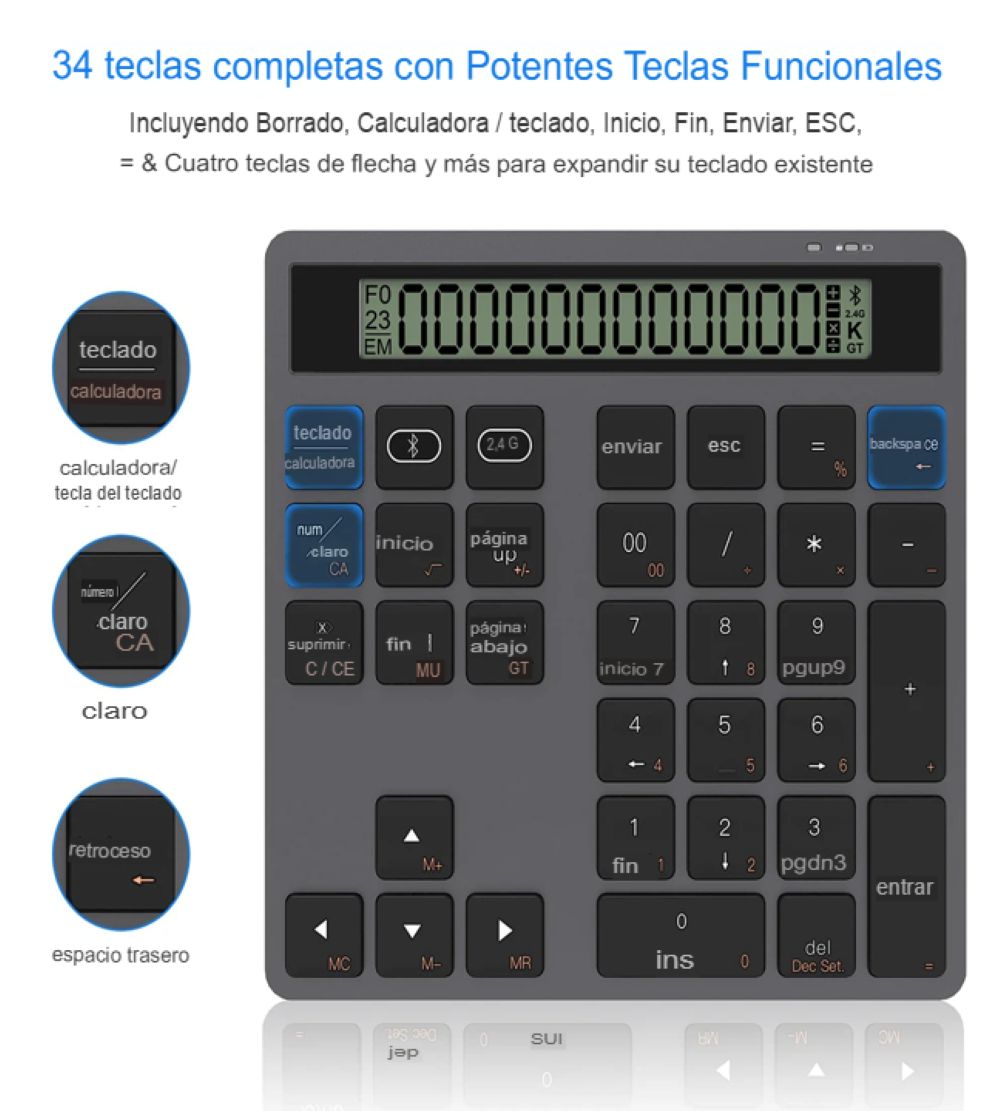 Teclado multifunción de 34 teclas: con NumLock, ESC, Delete, pgup, pgdn, insert.00 y una tecla de teclado/calculadora que puede cambiar el modo de calculadora y teclado directamente, etc. El teclado numérico está equipado con función de calculadora, perfecta para contadores financieros, estudiantes, especialistas en oficina.