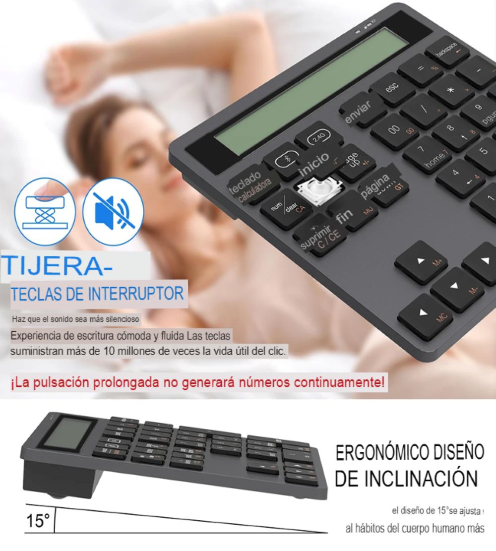 Estabilidad y diseño ultradelgado: con LLAVES SCISSOR-SWITCH silenciosos avanzados brindan una experiencia de escritura cómoda y suave, respuesta rápida y buen rebote táctil, mantienen la oficina silenciosa y mejoran la eficiencia del trabajo. El teclado numérico Bluetooth está fabricado con materiales ABS sólidos y de primera calidad para un uso duradero, 15° El diseño inclinable se adapta a los hábitos del cuerpo humano, apariencia de estilo delgado, ideal para trabajadores de hojas de cálculo, personal de contabilidad y oficial financiero.
